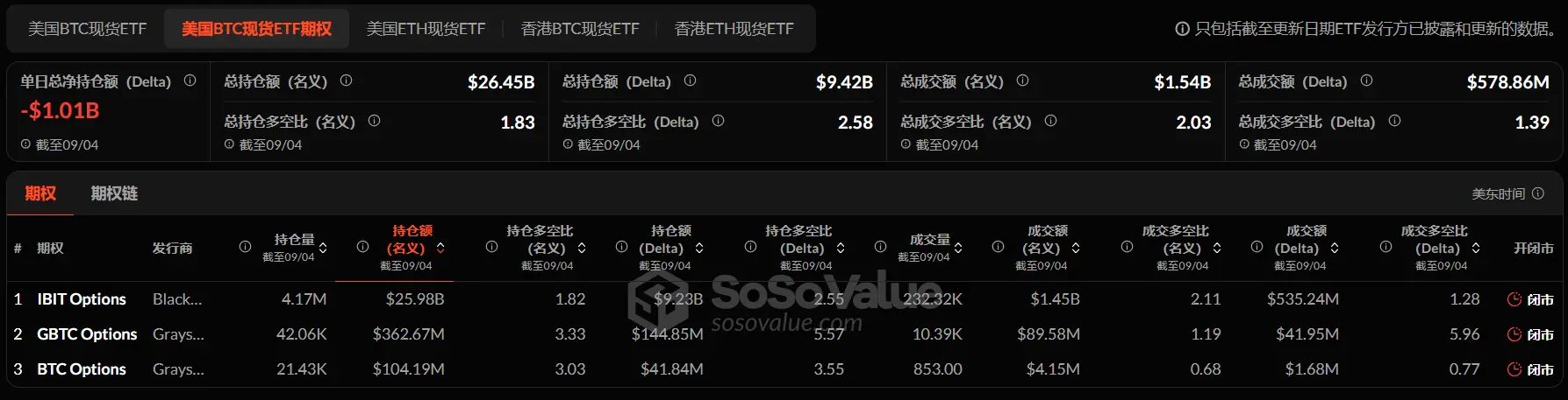 截至 9 月 4 日,美国比特币现货 ETF 期权名义总持仓额达 264.5 亿美元,名义总持仓多空比达 1.83。