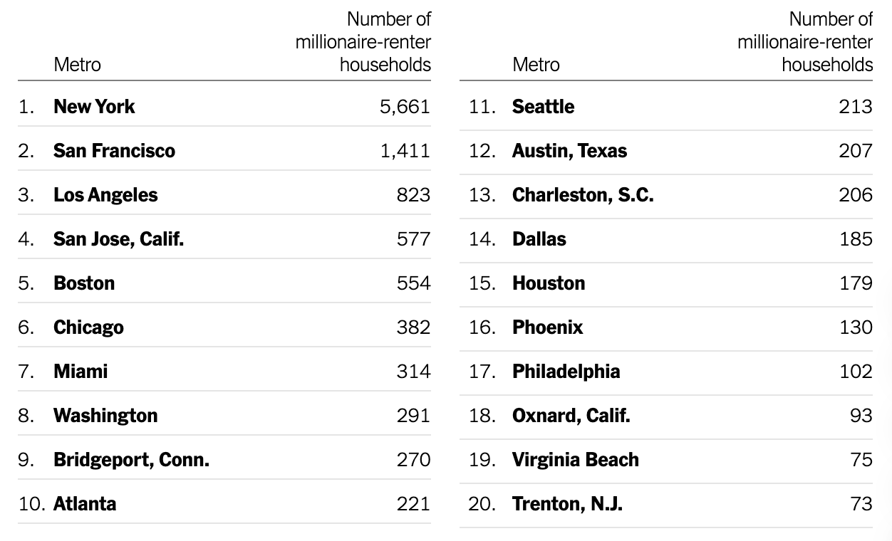 RentCafe 的研究发现,美国拥有最多百万富翁租户家庭的城市地区排名。