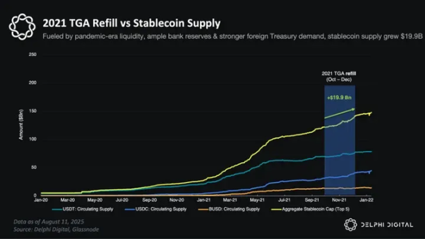 2025 年的 TGA(财政部一般账户)补充资金比之前的周期构成更大风险,因为隔夜逆回购缓冲实际上已耗尽。现在筹集的每一美元都会直接从活跃市场中抽走流动性。