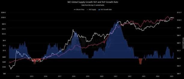 全球 M2 已飙升至 112 万亿美元的历史新高。在超过十年的数据中,比特币与流动性的长期相关性保持在 0.94,比股票和黄金更紧密。
