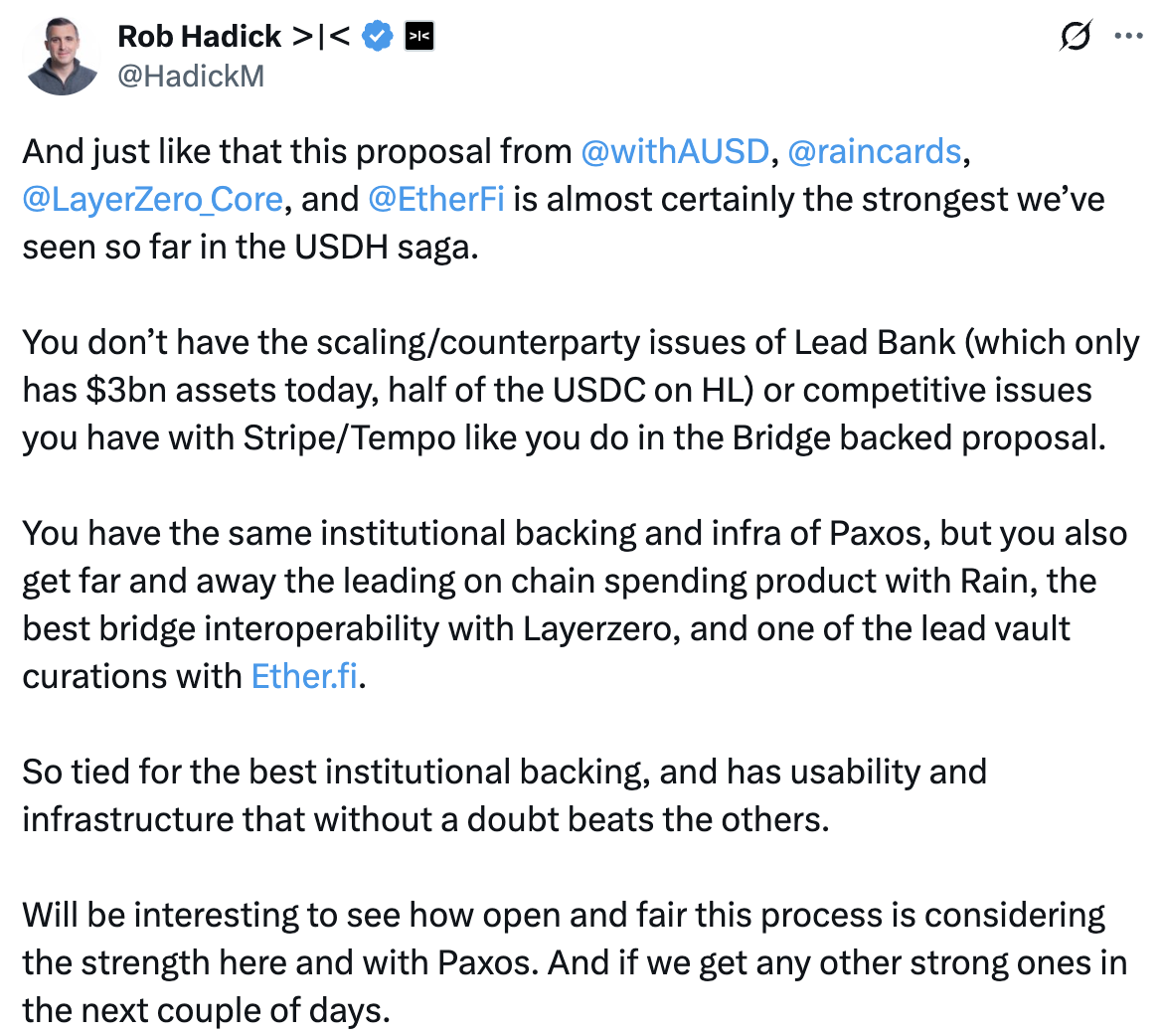 Agora 特别强调,其方案得益于 Agora 的白标架构,可以在提供解决方案的同时保持 USDH 之于 HyperLiquid 的品牌独立性,将如何运营 USDH 的选择权交给 Hyper,自己只提供底层的支持。Dragonfly 的普通合伙人 Rob Hadick 似乎对 Agora 钟爱有加,将其称之为目前所见的「最强方案」。