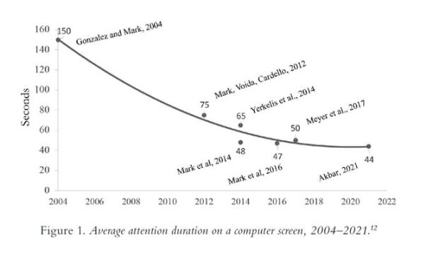 最近的研究显示,如今人们在屏幕前的平均注意力持续时间已降至约 50 秒,而在 2000 年代初,这一时间是 2 分钟。