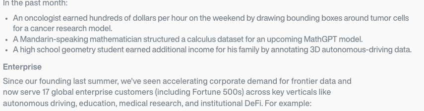 显然,用更多数据来训练AI,服务传统 Web2 企业,仍是上个 AI 炒作周期里的遗珠;虽然现在加密市场的AI叙事热度远不及上一波那么令人FOMO,但在大多数 AI 加密项目代币更偏 Meme 的情况下,这仍然是个相对有吸引力的叙事。