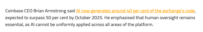 而Coinbase当前的战略似乎也在印证这一趋势。Coinbase CEO Brian Armstrong透露,Coinbase中40%的代码已由AI生成,目标是在2025年10月前达到50%以上。