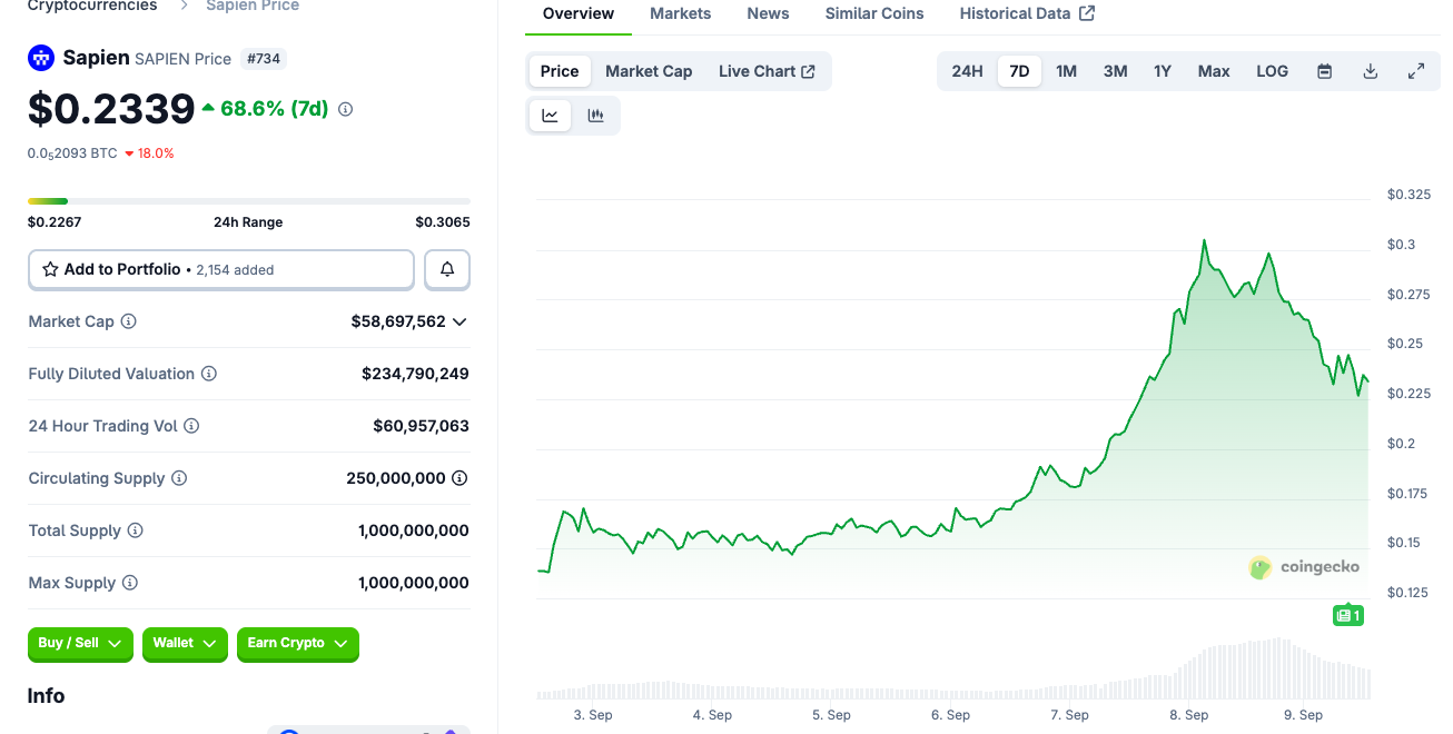 虽然通过币安Alpha上市的方式以及开盘后连续几日下跌的走势在当时引起了小规模的争议,但随着近几日其价格走高,市场也逐渐从深度挖掘中发现了Sapien项目独有的魅力和稳定的基本盘。