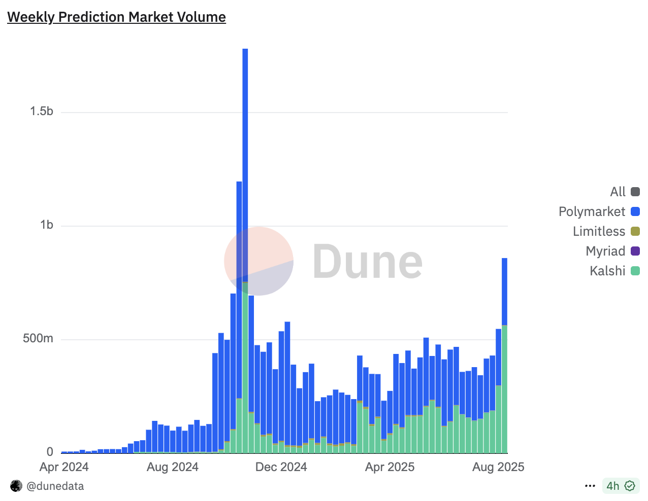 此刻,竞争格局也在悄然生变。Kalshi 招揽了加密圈知名 KOL John Wang 担任 Head of Crypto 后,表现亮眼。自8月25日起,其周交易量开始反超Polymarket,两大巨头的较量愈发激烈。