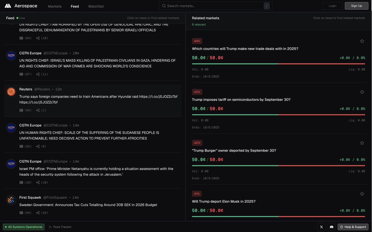 年仅 16 岁的工程师 @agpkeleta 打造了 Aerospace。这是一个配备实时新闻推送的预测市场交易终端,能够将 alpha 信息与相关市场精准匹配。这使得交易者能够在市场解决为"是"之前,基于确认的结果快速狙击市场机会。目前为止网站仅支持 Polymarket,Kalshi 在不久之后也将上线。