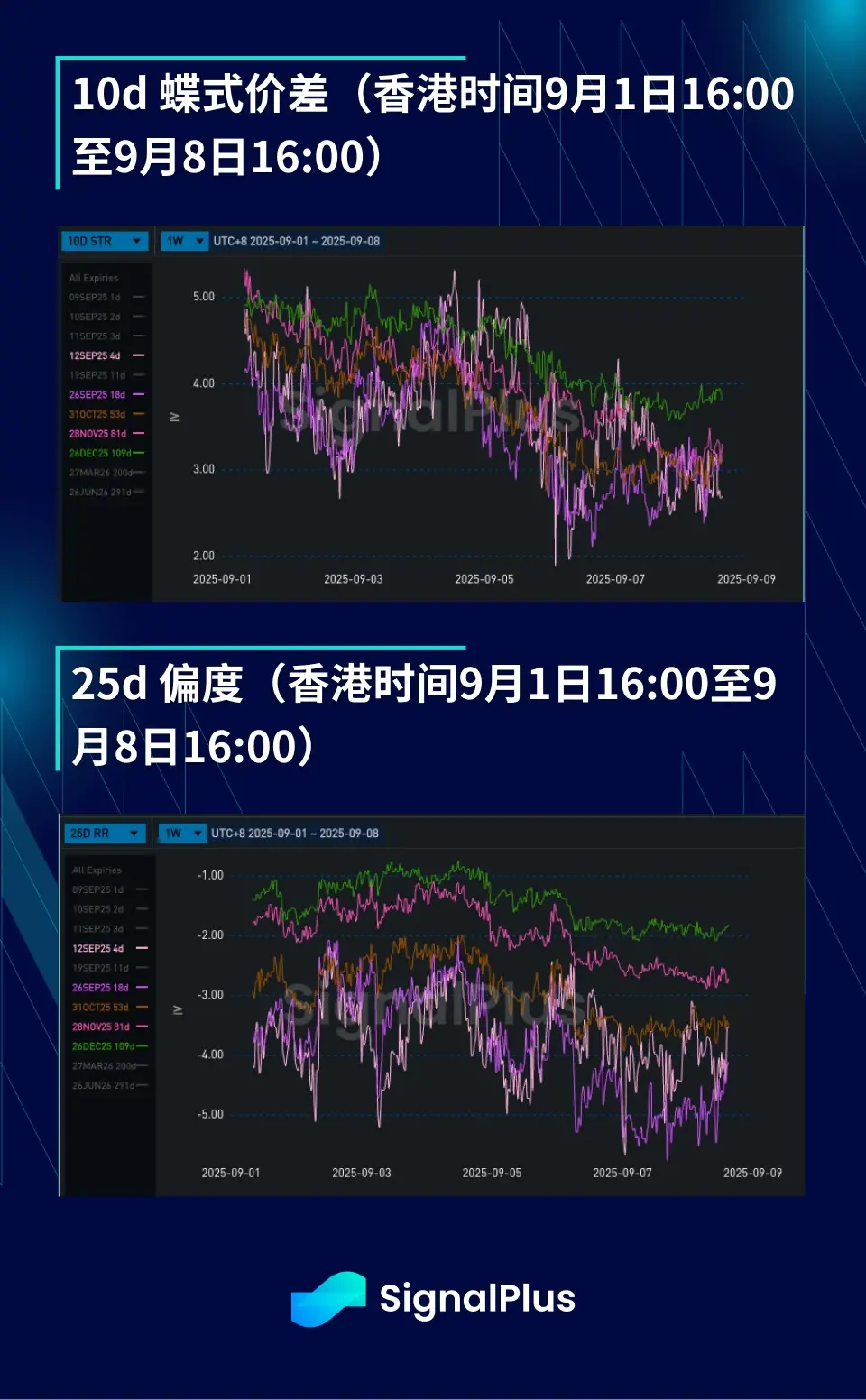 - 期权需求持续疲软,唯一显著买盘来自非农数据前后的短期看跌对冲(事件后平仓)。由于缺乏波动率买盘,市场不愿抬高远期波动率的定价,9月末及10月合约隐含波动率已逼近近期实际波动水平(35–36vol)