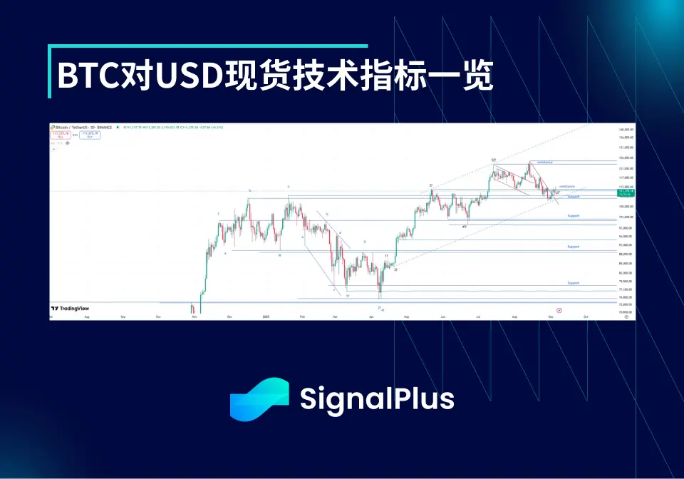 - 过去两个月BTC现货市场走势不甚明朗:8月虽触及长期目标区间(12.5–13.5万美元)下沿,但形态欠佳,需谨慎评估后续价格行为。当前技术结构呈现双重顶形态,两次触及关键位12.5万美元后遭到反弹,预示市场可能进入横盘调整模式。若再次上探前高失败,或将引发更深度回调