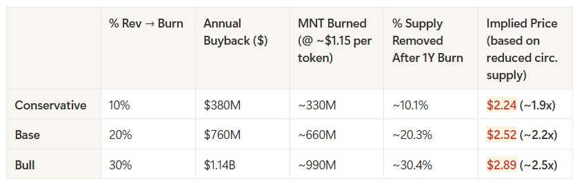 如果治理将 20% 的 CEX 收入分配给 MNT 的回购与销毁: