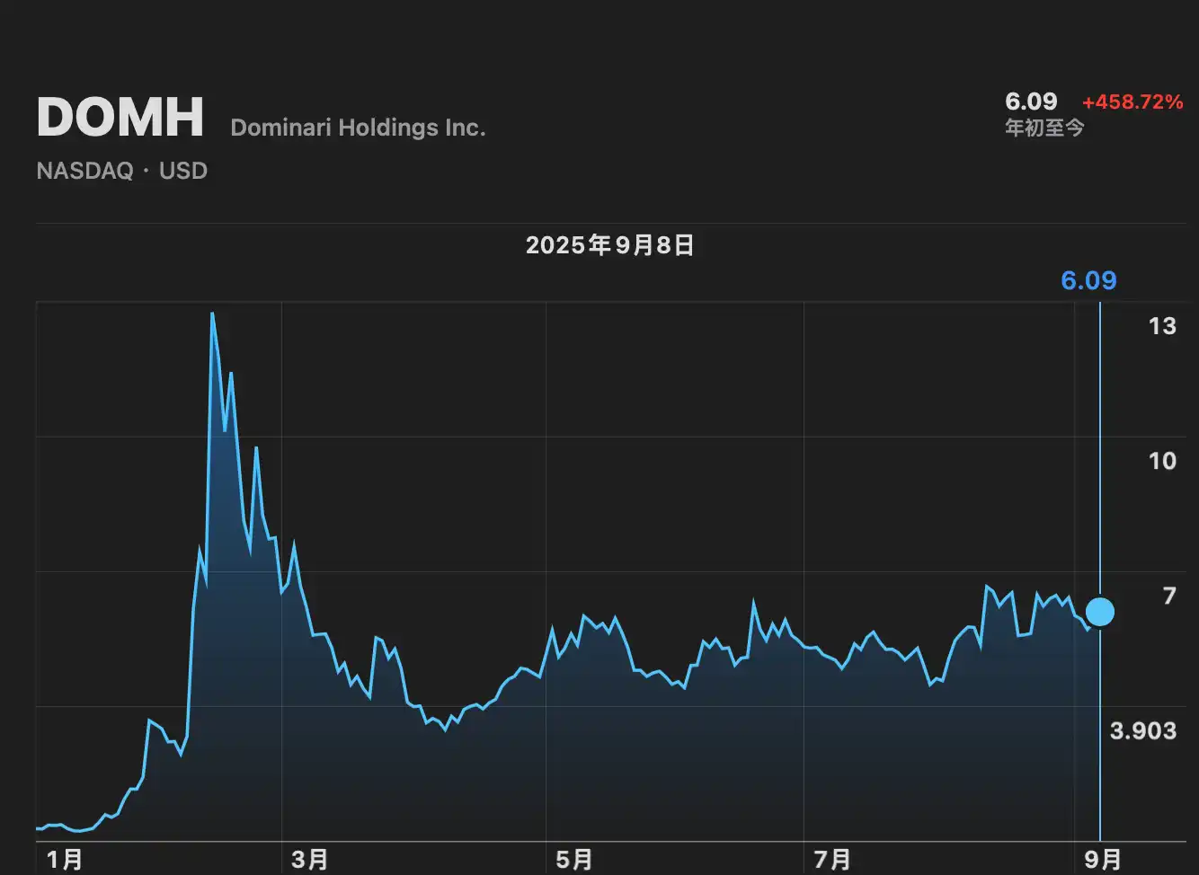两兄弟的加入并非象征性的。他们各自通过私募配售投资 100 万美元购买了约 21.6 万股,另外还因担任顾问获得了 75 万股作为补偿。消息一出,Dominari 的股价从 1.09 美元飙升至 13 美元,最高涨幅超过 1200%。