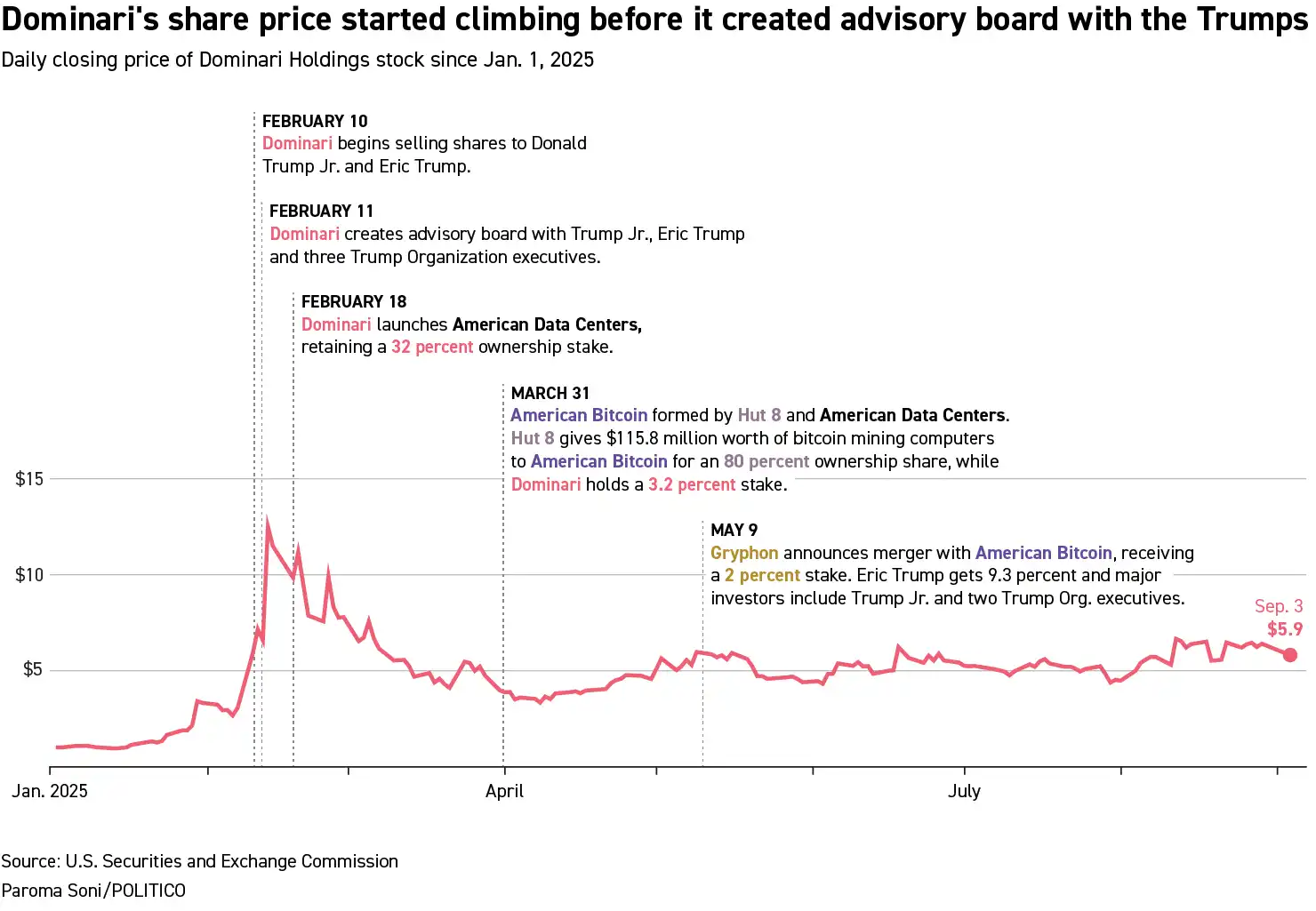 American Bitcoin 的成立中,Eric Trump 持有约 7.5% 的股份,成为最大的个人投资者。Dominari Holdings 持有约 3% 的 American Bitcoin 股份。两位特朗普儿子还同时担任 Dominari 的顾问,各持有该公司约 6-7% 的股份。