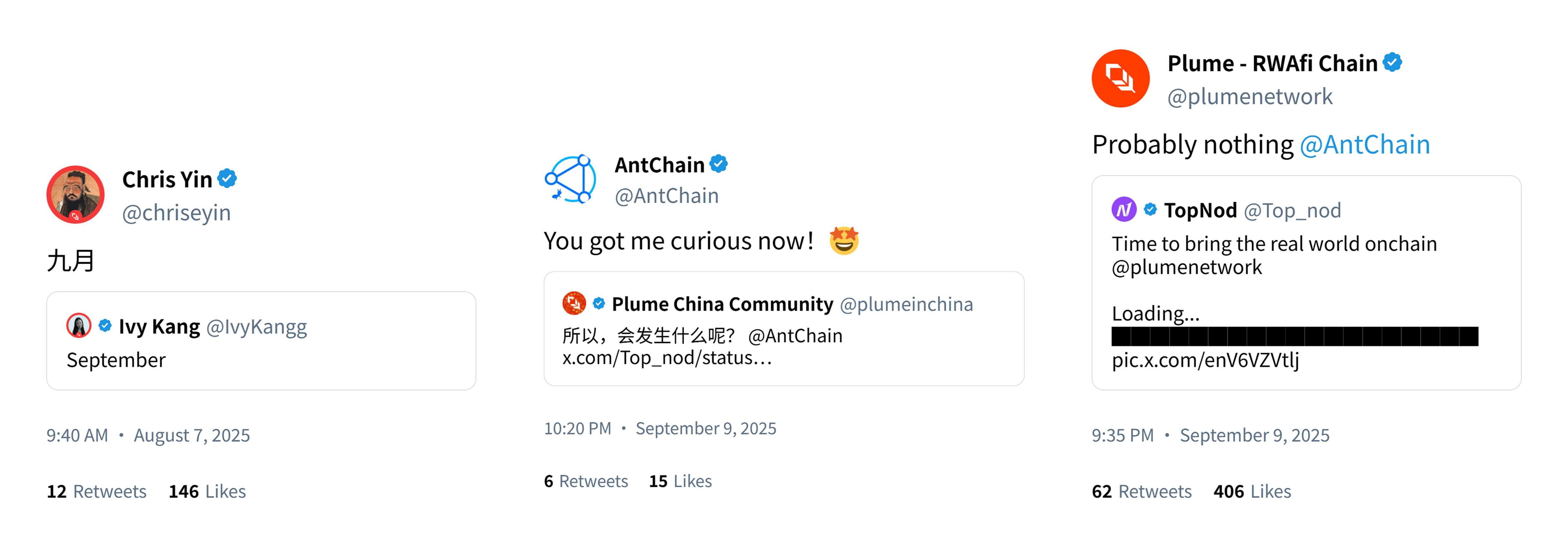 8 月初,Plume 团队以「September」预告引发联想,CEO Chris Yin 亦以中文沟通,社区据此推测九月或有合作进展。近期 Plume 与 AntChain 的公开互动进一步放大了这种期待。