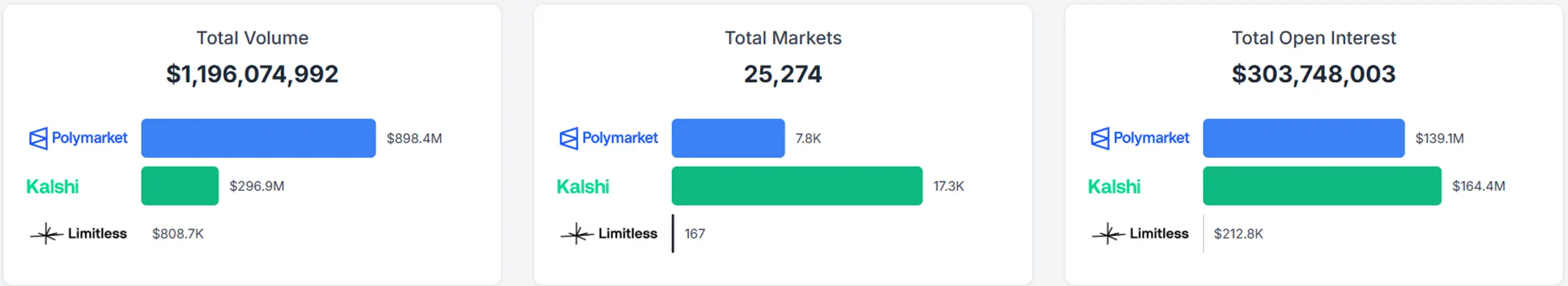 今年,预测市场最直观的变化之一是体量。据 Polymarket Analytics 数据,截至9月9日,头部预测平台累计成交已接近 12 亿美元,累计创建的市活跃市场数约 2.5 万,场内未平仓合约规模在 3 亿美元左右。1kx 合伙人 Michael Hua 表示,这种持续的兴趣让许多风投对这个市场的投资重新获得信心。