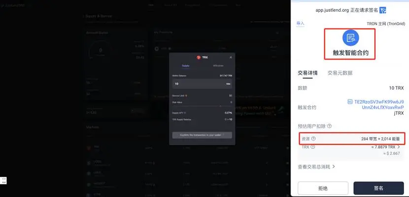 【使用JustLendDAO存储TRX触发了智能合约,需要消耗能量和带宽。】