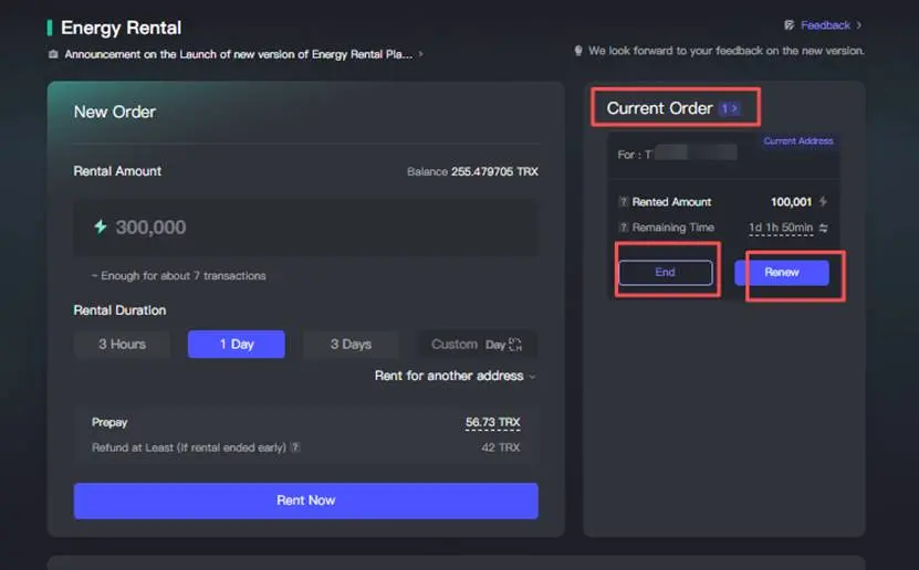 3.结束租赁,退还押金:租赁完成后,可在“能量租赁界面”实时管理订单:支持退还租金(提前结束租赁)、延长租期(需追加费用)、查看剩余能量与租期。