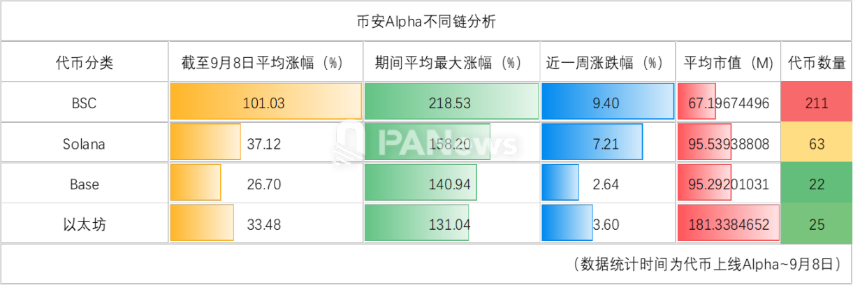 从链的分布来看,目前上线的代币当中,Base 链有 22 个,平均涨幅达到 26%;BSC 链的代币数量有 211 个,平均涨幅达到 101%;以太坊链上的代币有 28 个,平均涨幅约为 33.4%;Solana 链上的代币有 64 个,平均涨幅约为 37%。