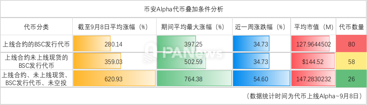 那么,回到我们的终极问题,什么样的代币可能是币安 Alpha 当中表现最好的类别?结合此前的分析,我们能够从多个维度当中,看到几个潜在的利好条件,分别是上线合约交易、发行于 BSC 链、未进行空投、未上线现货交易。