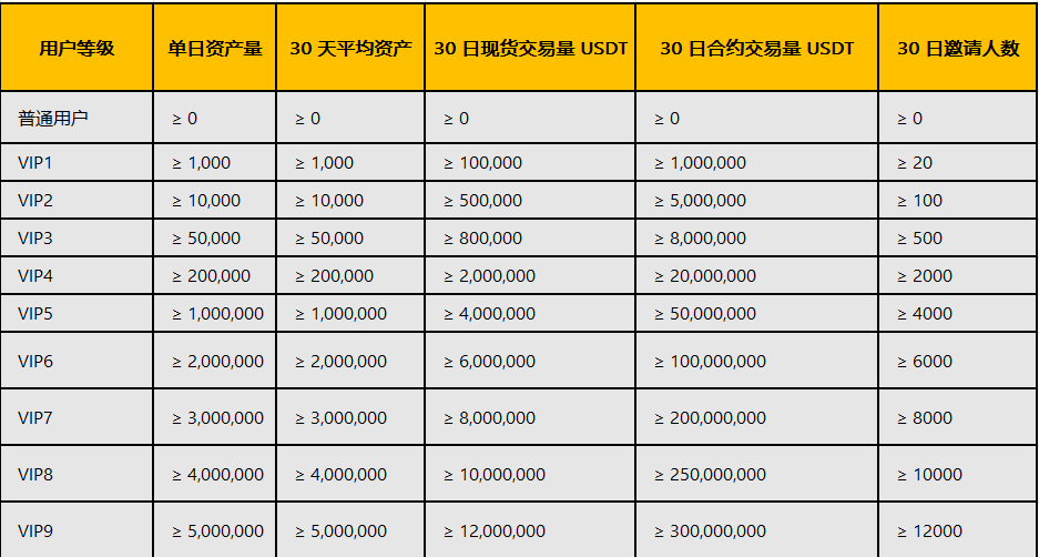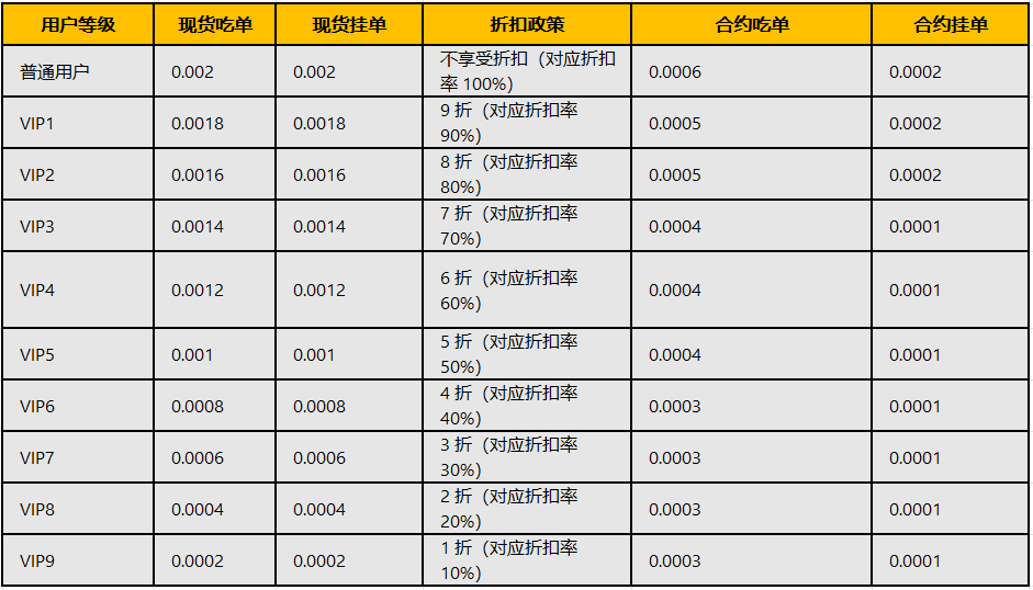 具体 VIP 等级与手续费详情如下: