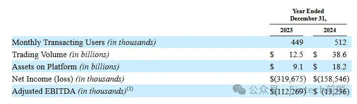 2024年运营数据: 展现出增长态势,实现月度交易用户 51.2 万,全年交易量达 386 亿美元,平台托管资产规模达到 182 亿美元。