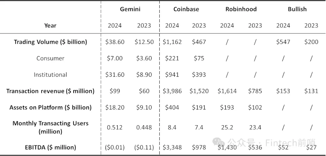 Coinbase 和 Robinhood 在 2024 年均实现了盈利(EBITDA 均为正值),而 Gemini 的 EBITDA 仍然为负值。