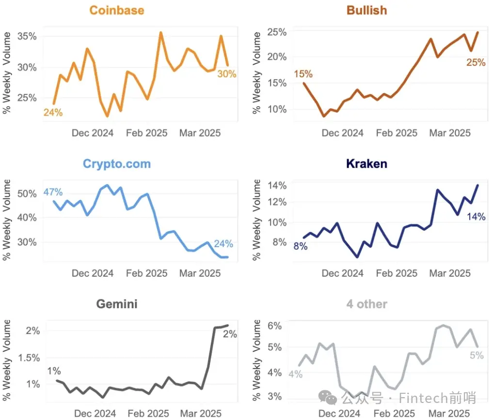 Gemini 在合规现货交易所的版图中处于“头部阵营但非第一梯队”。根据 Kaiko 的综合排名,2025 年春季其现货份额一度由约 1% 升至 2%,呈现“进两步退一步”的弹性特征,阶段性抬升后又回吐部分增量,整体体现出在合规赛道中的上升动能与波动并存。