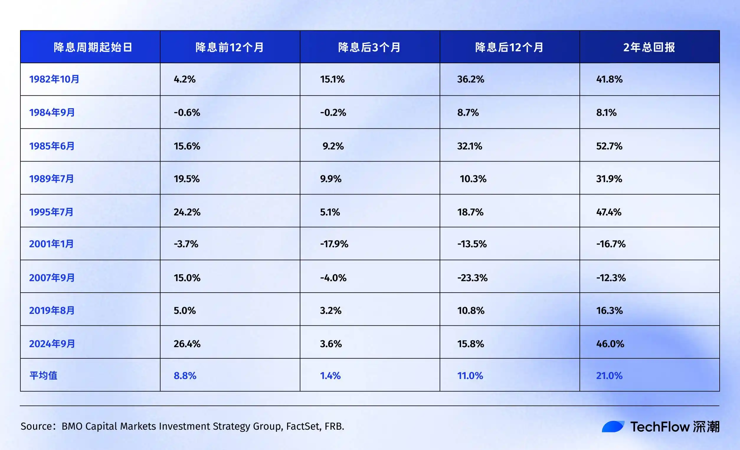 根据 BMO 的研究数据 ,我们可以看到过去 40 多年降息周期中标普 500 的详细表现: