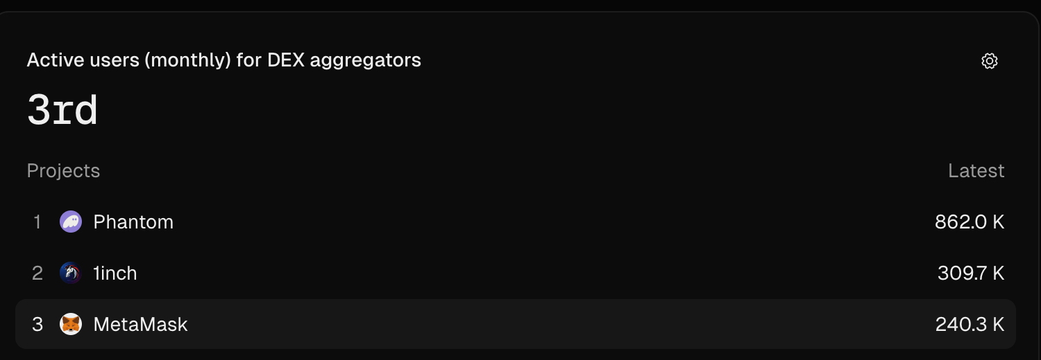 MetaMask 曾是钱包赛道当之无愧的霸主,在 2021 年牛市和 2024 年 1 月的高峰期创下了 3000 万月活用户的辉煌记录。然而,根据 Token Terminal数据,近几个月其月活用户均在 25 万左右,市占率降至 14.8%,在同类产品中滑落至第三位。