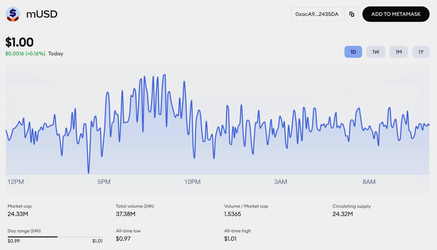 当前 MetaMask 官网已提供 mUSD 的购买和兑换界面,距离 mUSD 上线不到 24 小时,据 Etherscan 数据,截止发文,mUSD 当前的流通供应量为 2436 万枚,其中持币者 179 人,交易 1539 笔。