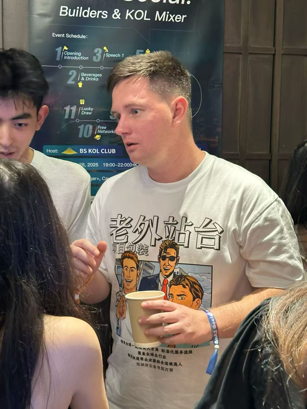 然而,真正抢镜的,却是一件白色 T 恤,上面印着四个汉字:“老外站台”。