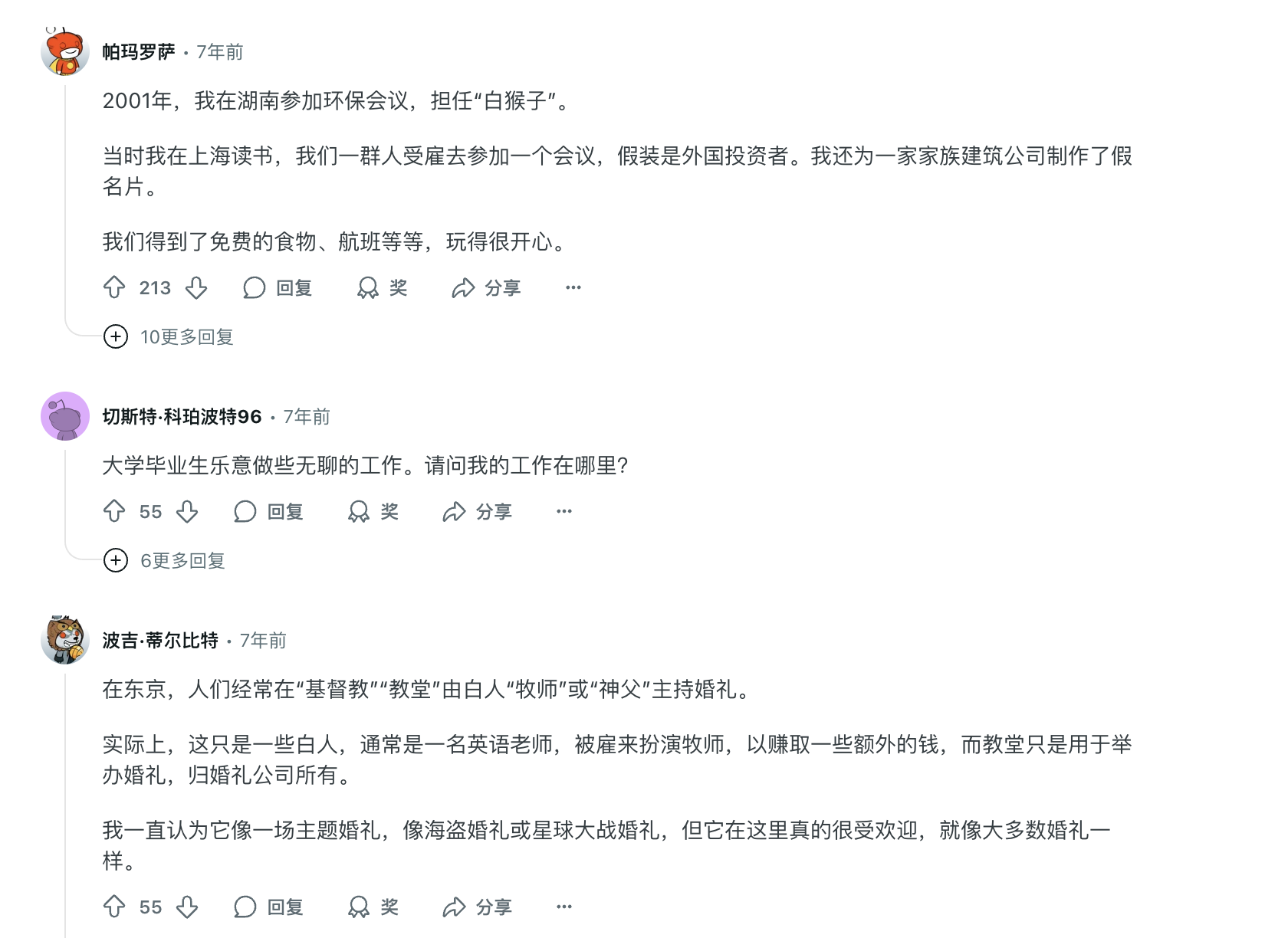 在论坛 Reddit 上,一众老外交流曾经在东亚做 White Monkey 的经历: