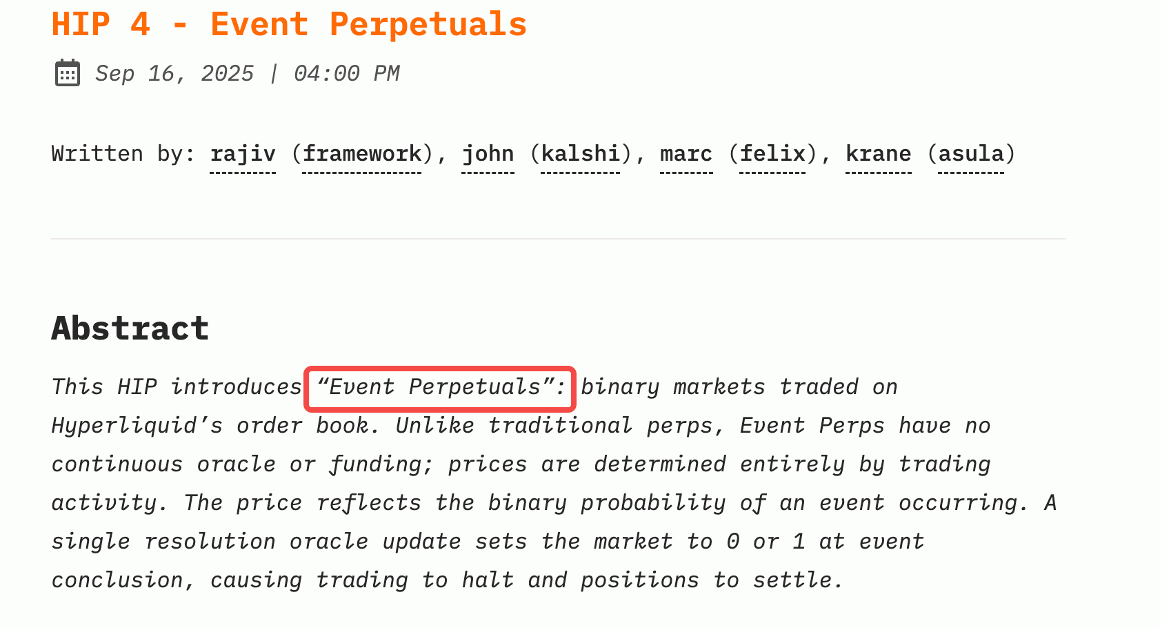 值得注意的是,Hyperliquid 的这份提案,撰写者阵容颇为有趣:既有来自Framework Ventures的投资人,也有来自预测市场平台Kalshi的团队成员,还包括Felix Protocol和Asula Labs的开发者。