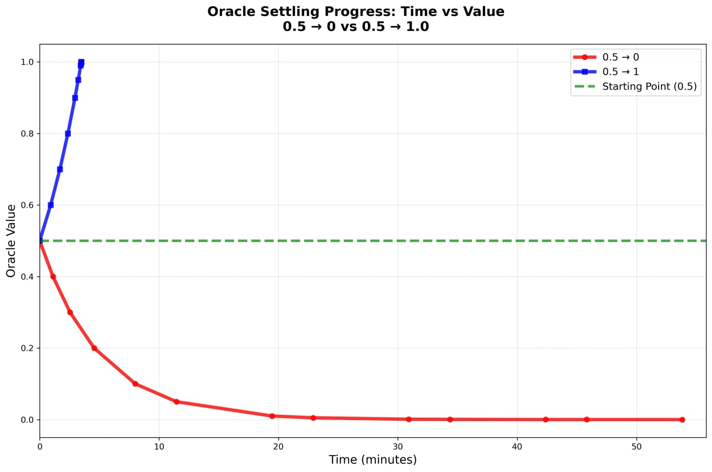 HIP-3(Hyperliquid现有的市场部署规范)限制了价格每tick最多变动1%。这意味着,如果比赛结果确定,价格要从0.5跳到1.0,需要整整50分钟才能完成。