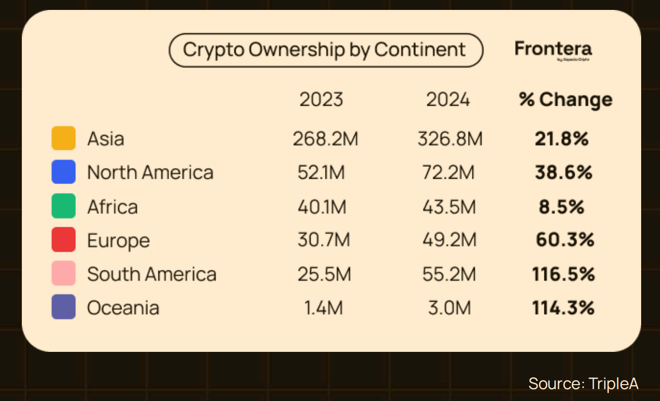 过去 15 年,加密货币从自由主义极客的小众玩具,演变为全球金融版图的关键组成,彻底改变了我们对货币与价值的认知与使用方式。TripleA 数据显示,全球持有虚拟资产的人口已增至 5.62 亿 (2023 年为 4.2 亿),占世界总人口的 6.8% 。