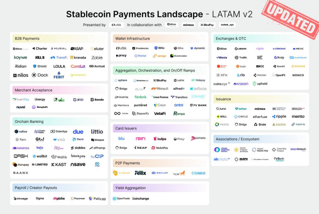 我们也简单梳理了下 Chuk Okpalugo 梳理出来的拉美加密金融生态全景图,从稳定币支付的角度发现: