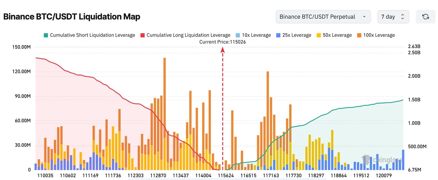 如果比特币重新站上并守住 117,000 美元,可能很快打开通往新高的道路。然而,如果美联储因近期通胀数据而推迟降息,市场可能跌回 113,000 美元或更低。订单簿显示这些水平有大量流动性,交易员已为扫单做好准备。