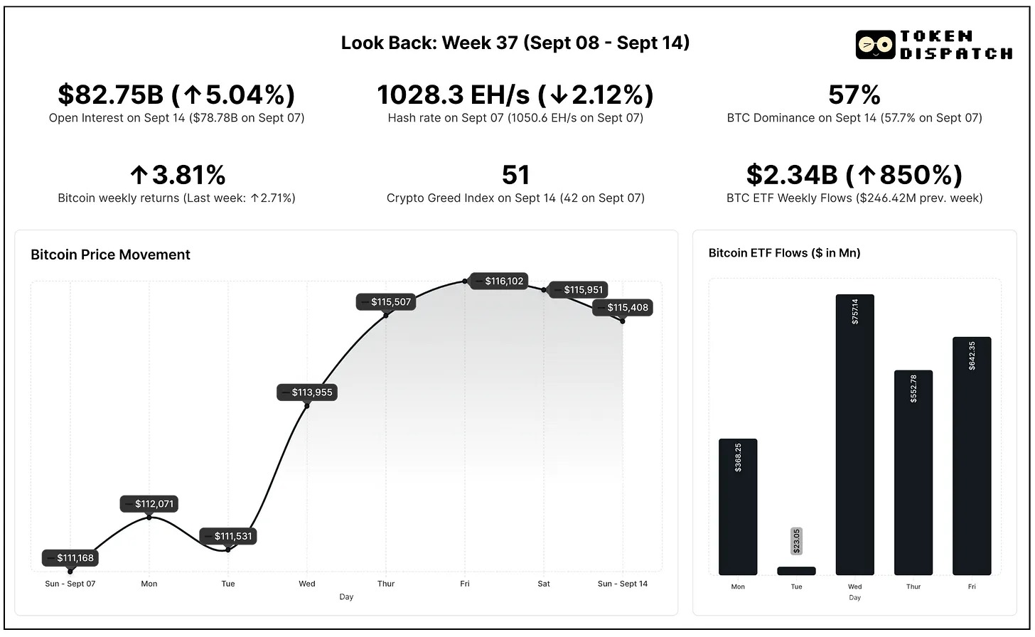 市场上涨,并录得两个多月来首次连续两周上涨。然而,市场难以突破 11.7 万美元的阻力位,市场在等待一个关键事件:美联储 9 月 17 日的决定。
