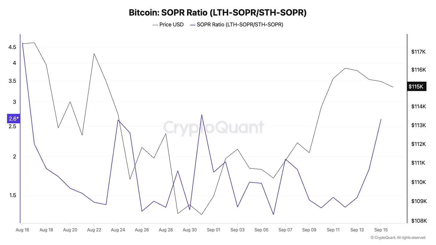 长期持有者 / 短期持有者的 SOPR 比率保持高位,表明卖压主要来自经验丰富的钱包,而非紧张的新进入者。