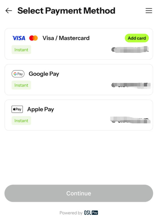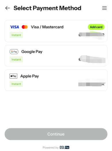 第三步:选择使用第三方钱包或是信用卡进行支付,如果未绑卡需要先绑卡