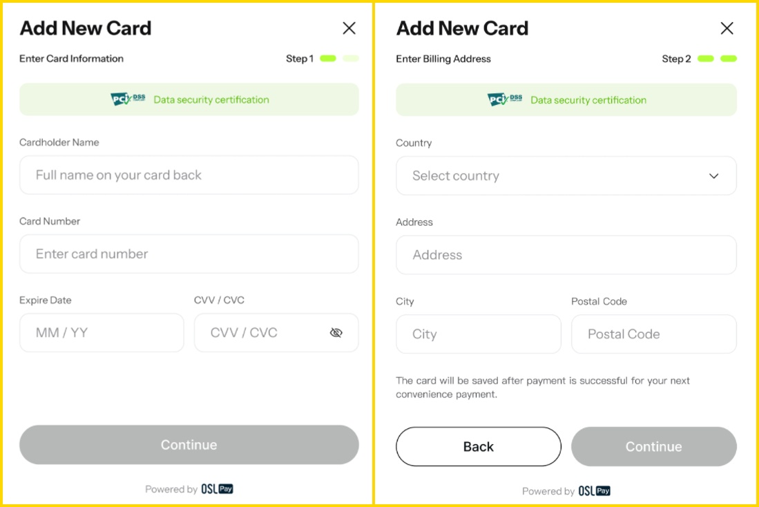 第四步:依照页面填入完整信息,点击【Continue】完成绑卡,非信用卡支付可忽略