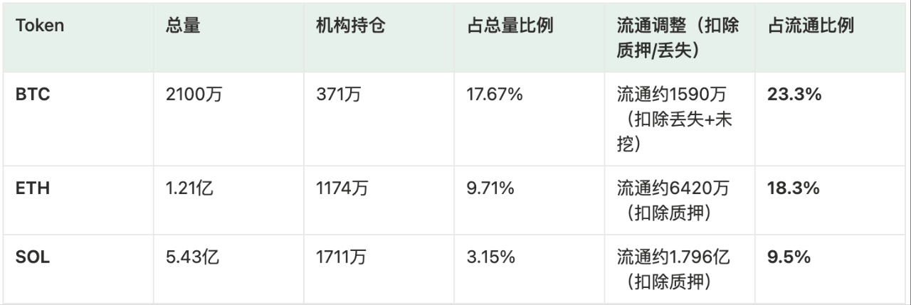 从对比可以看到:BTC、ETH的机构持仓占流通量> 18%;SOL 目前仅 9.5%,可能存在补足空间。