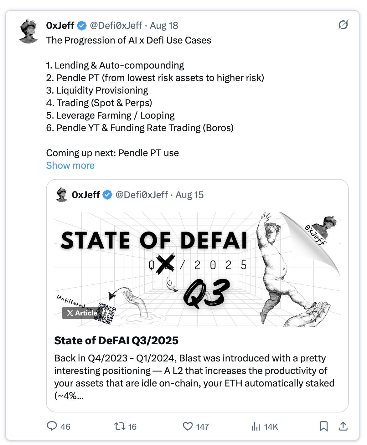 AI x Defi 用例的进展 1. 借贷和自动复利 2. Pendle PT(从最低风险资产到高风险资产) 3. 流动性供应 4. 交易(现货和永续) 5. 杠杆挖矿/循环 6. Pendle YT 和资金费率交易 (Boros)