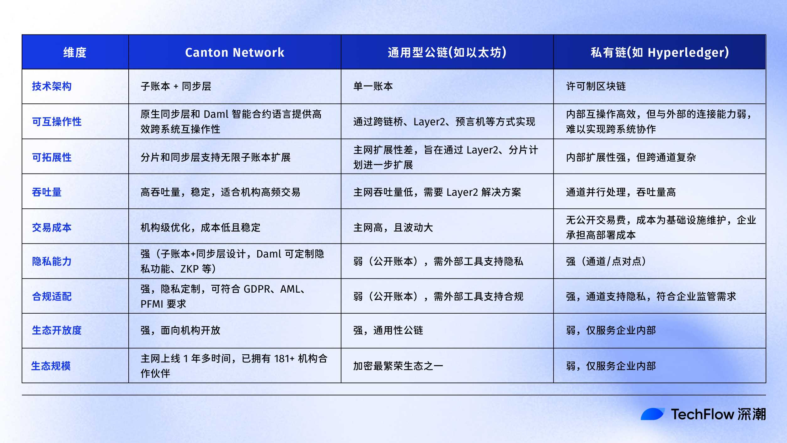 通过下图,我们也能更直观的感受到,Canton Network 作为专为机构级应用打造的公共区块链网络,与私有链以及其他通用公链的主要区别: