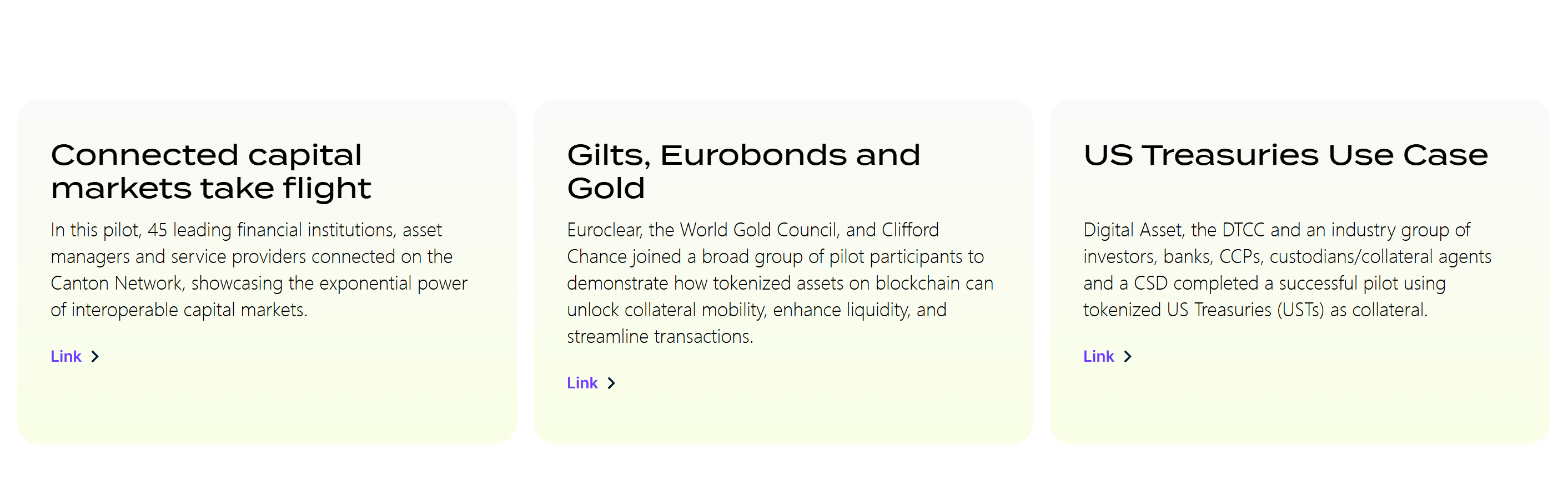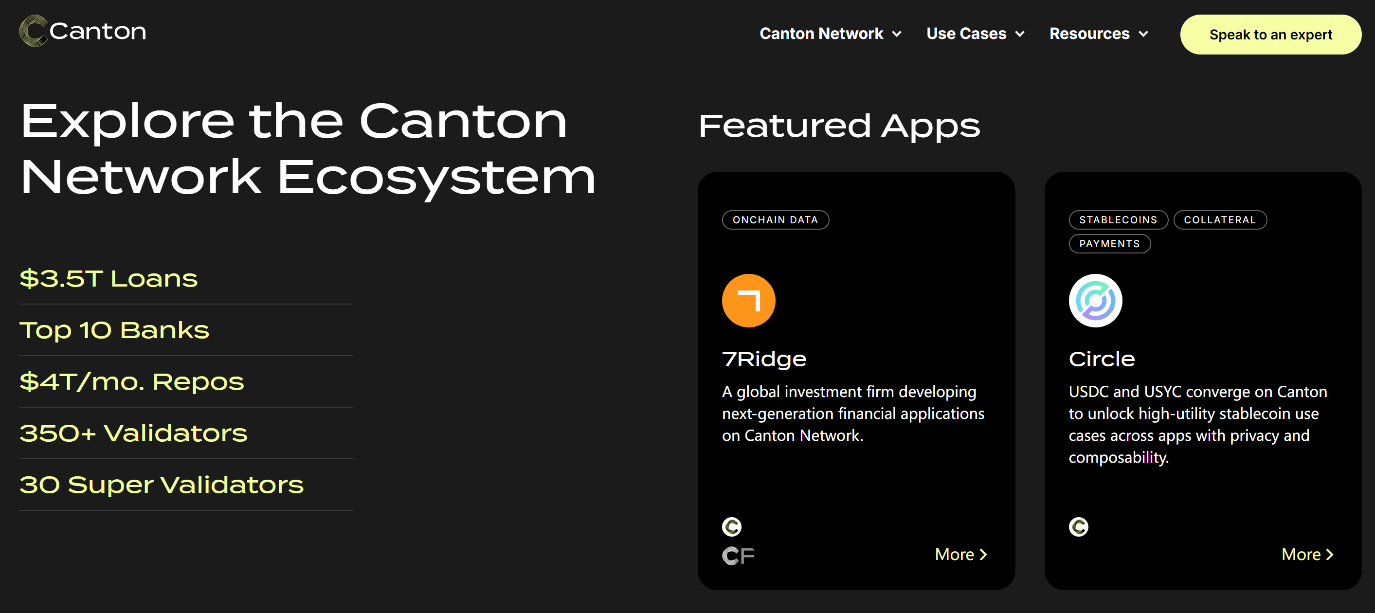 2025 年 8 月,Canton Network 与美国银行、Citadel、DTCC、法国兴业银行、Circle 等机构合作,完成首笔实时链上美债融资交易,使用 USDC 稳定币与代币化美债实现周末即时结算,绕过传统仅限工作日的结算限制。