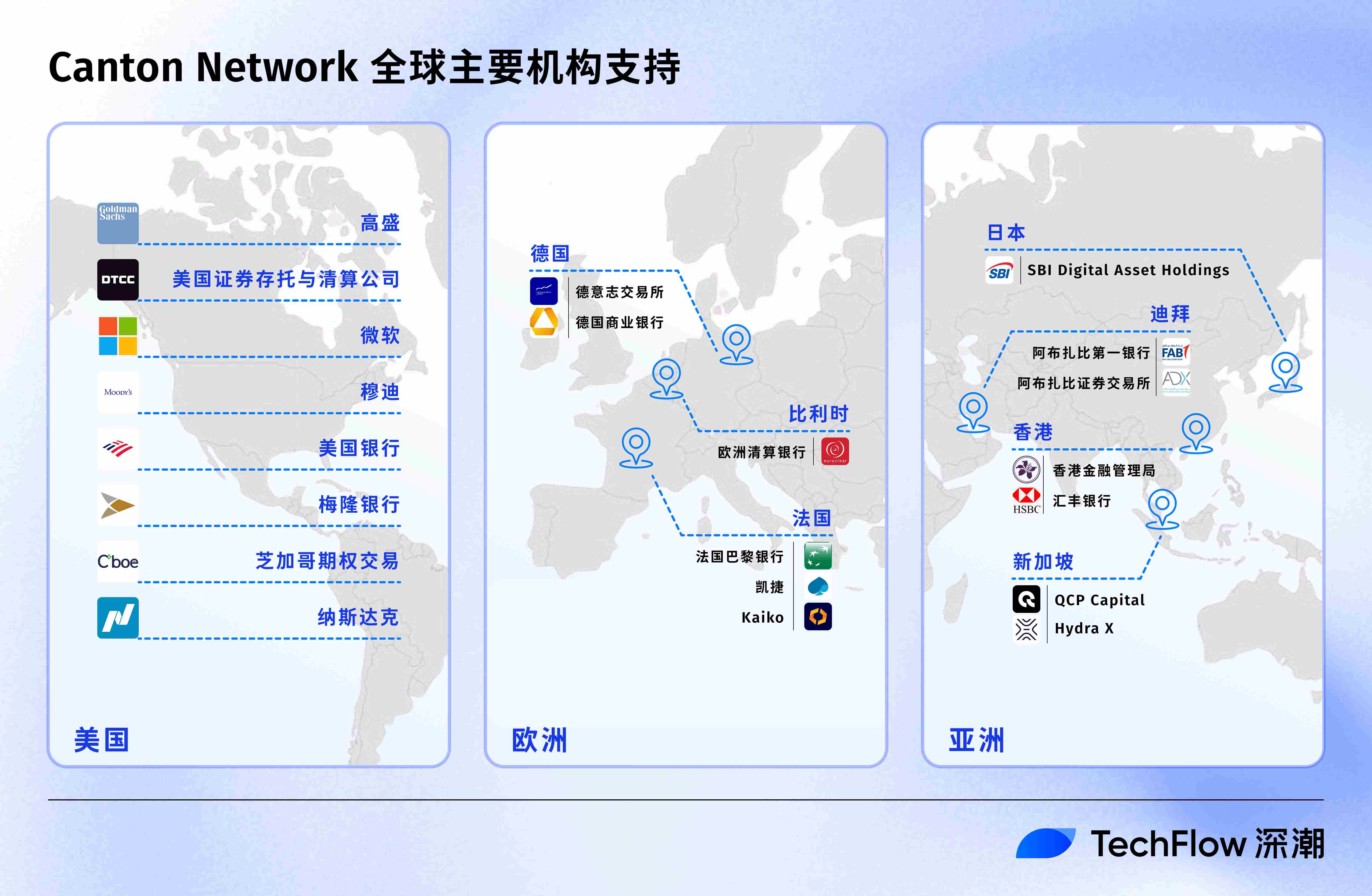 北美是 Digital Asset 的总部所在,基于团队深厚的机构创业 / 就业背景,Canton 在北美市场的机构支持名单包括高盛、微软、梅隆银行、美国银行、穆迪、Paxos 等一系列响当当的名号。在美国 SEC「加密计划」推动美国金融市场全面迁移至链上的号召之下,Canton 正积极与支持者们合作,推动美元稳定币、代币化美国国债等关键金融基础设施的上链进程,为传统金融注入链上高效运作的新活力。