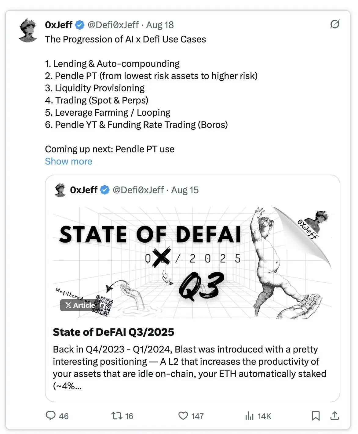 AI x Defi 用例的进展1. 借贷和自动复利 2. Pendle PT(从最低风险资产到高风险资产) 3. 流动性供应 4. 交易(现货和永续) 5. 杠杆挖矿/循环 6. Pendle YT 和资金费率交易 (Boros)