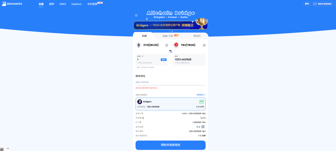 Bridgers(也称AllChain Bridge)是一个跨链流动性聚合器,通过聚合来自外部DEX和桥的流动性,计算资产跨DEX和桥的最佳执行路径,然后使用智能合约执行交易,如将可将以太坊链上的ETH直接跨链兑换为波场TRON链的TRX。