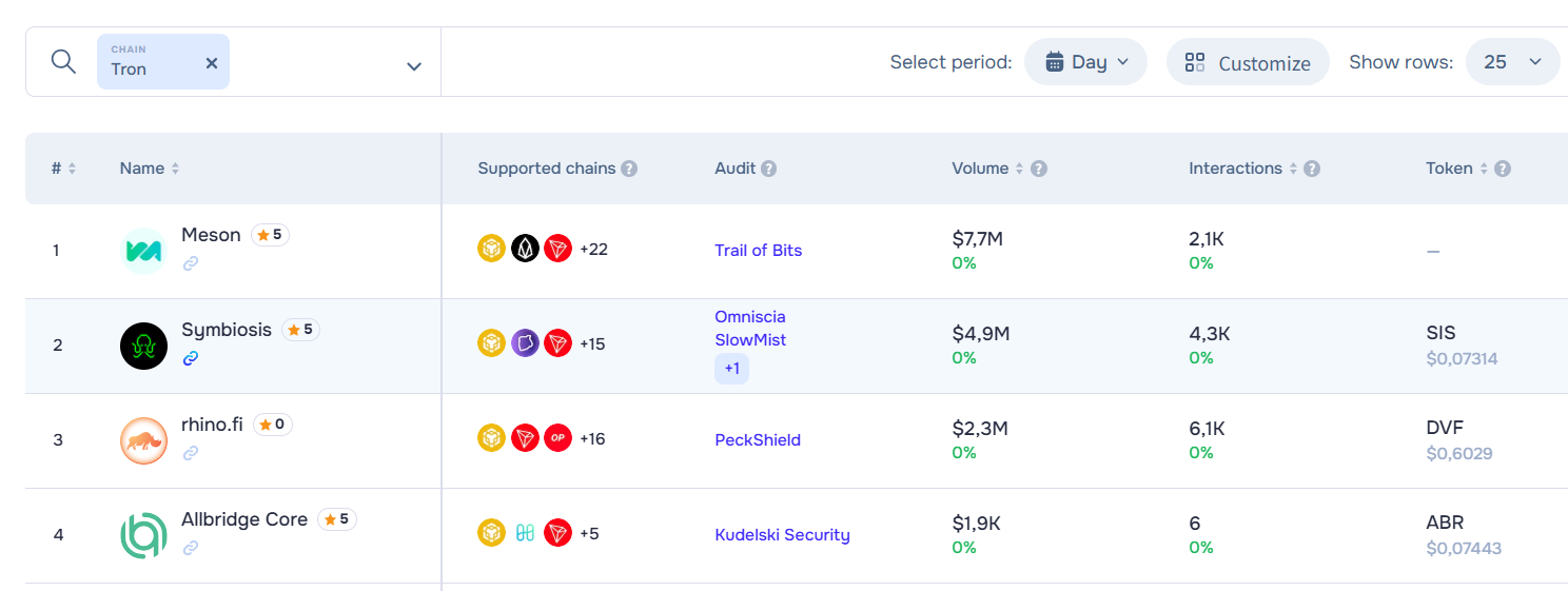 第三方跨链桥工具:覆盖公链网络更多,可为用户提供了更多选择。根据跨链聚合平台ChainSpot 数据,目前已有17个第三方跨链设施支持波场TRON网络,可实现与比特币、以太坊、Solana、BNB Chain、Layer2等多个公链之间的资产互通,用户常用的前四大工具包括:Meson、Symbiosis、rhino.fi、Allbridge Core。