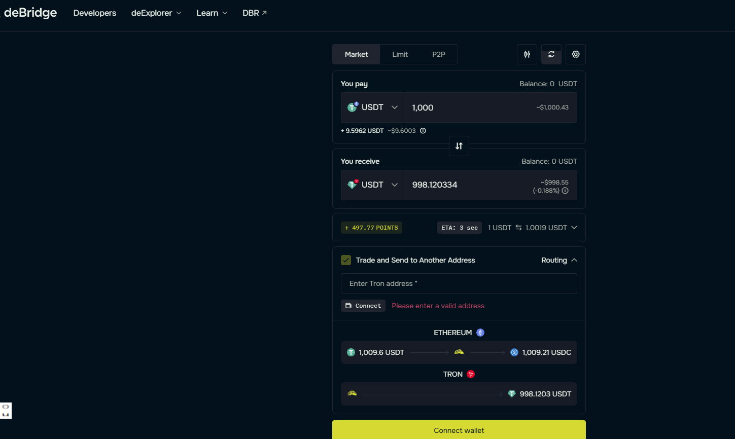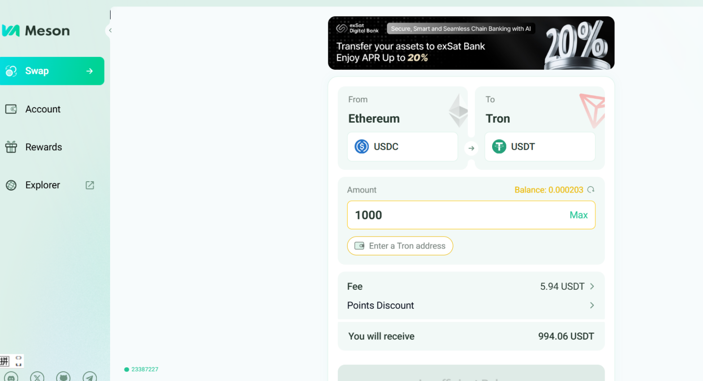 通过Meson平台,目前用户可将以太坊、Arbitrum等Layer2、Solana等多种链上的USDC、USD1、USDT等稳定币,快速跨链兑换为波场TRON网络的TRC20-USDT。