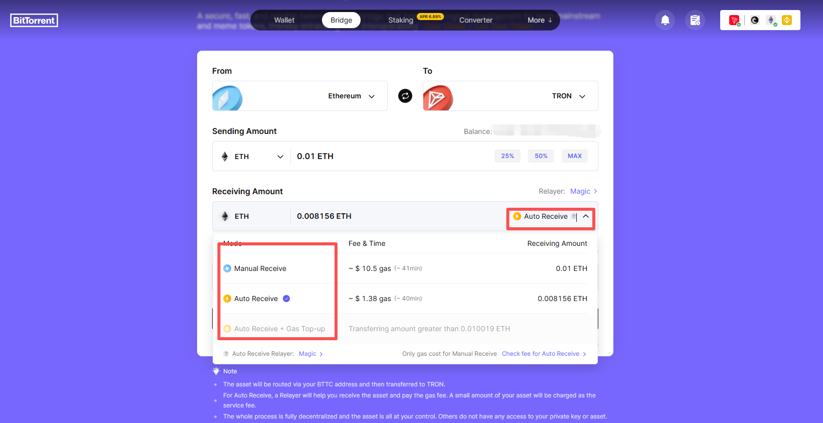 为提升用户体验,BTTC提供Auto Receive(自动接收)模式,由Relayer垫付目标链Gas费,使用户可快速接收跨链资产,避免因无Gas代币导致资产滞留。需要注意的是,该模式下Gas费将从跨链资产中直接扣除,到账的跨链资产数额是减去扣除的Gas费金额。